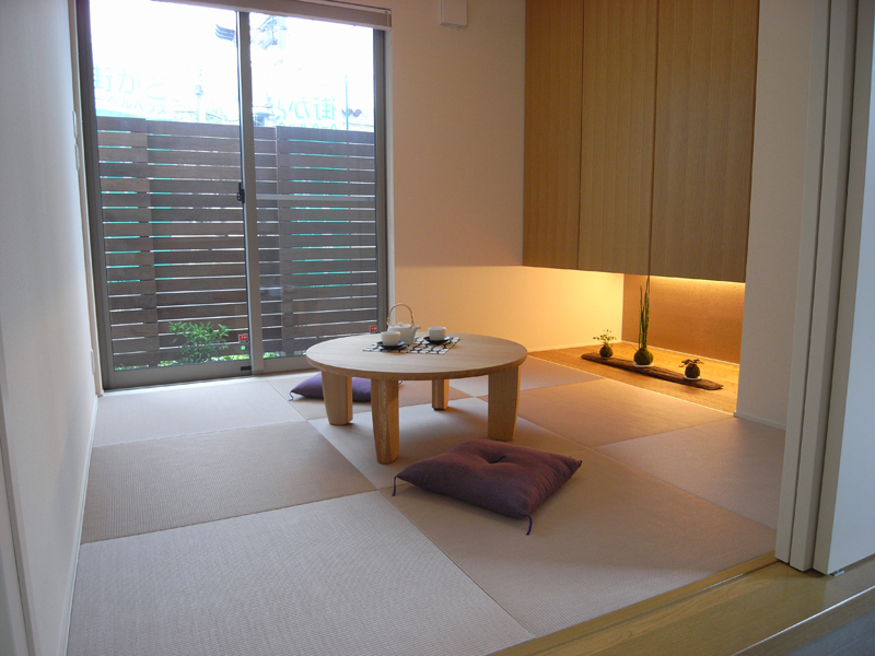 這是位于玄關(guān)旁邊的日式房間。懸掛壁柜下面的壁龕有實(shí)木的味道。